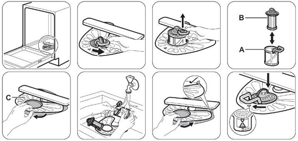 - Überprüfen Sie die Siebe im Innenraum des Geschirrspülers auf eine Verschmutzung.